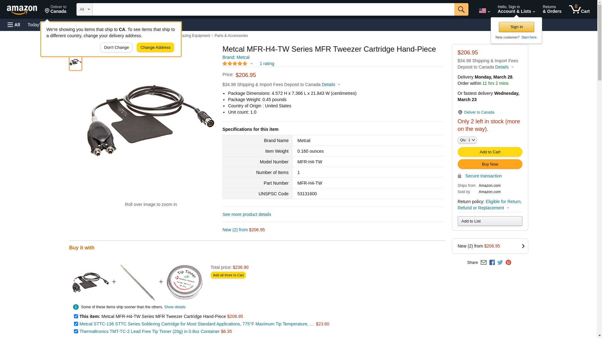 Metcal MFR-H4-TW Series MFR Tweezer Cartridge Hand-Piece