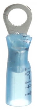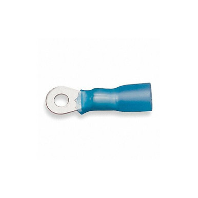'Ring Terminal, Insulation Type Heat Shrink, Stud Size #10, Wire Range 16 to 14 AWG, Insulation Color Blue, Seam Brazed, Max. Temp. 221 Degrees F, Max. Voltage 600V, Overall Length 1.000 In., Connection Material Copper, Standards UL Listed, CSA Certified, Terminal Connection Crimp, Tongue Width - Wire Connector 0.31 In., Package Quantity 25'
