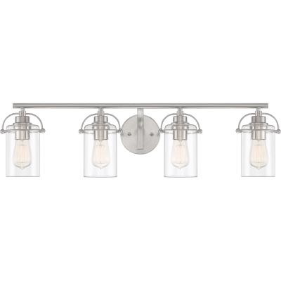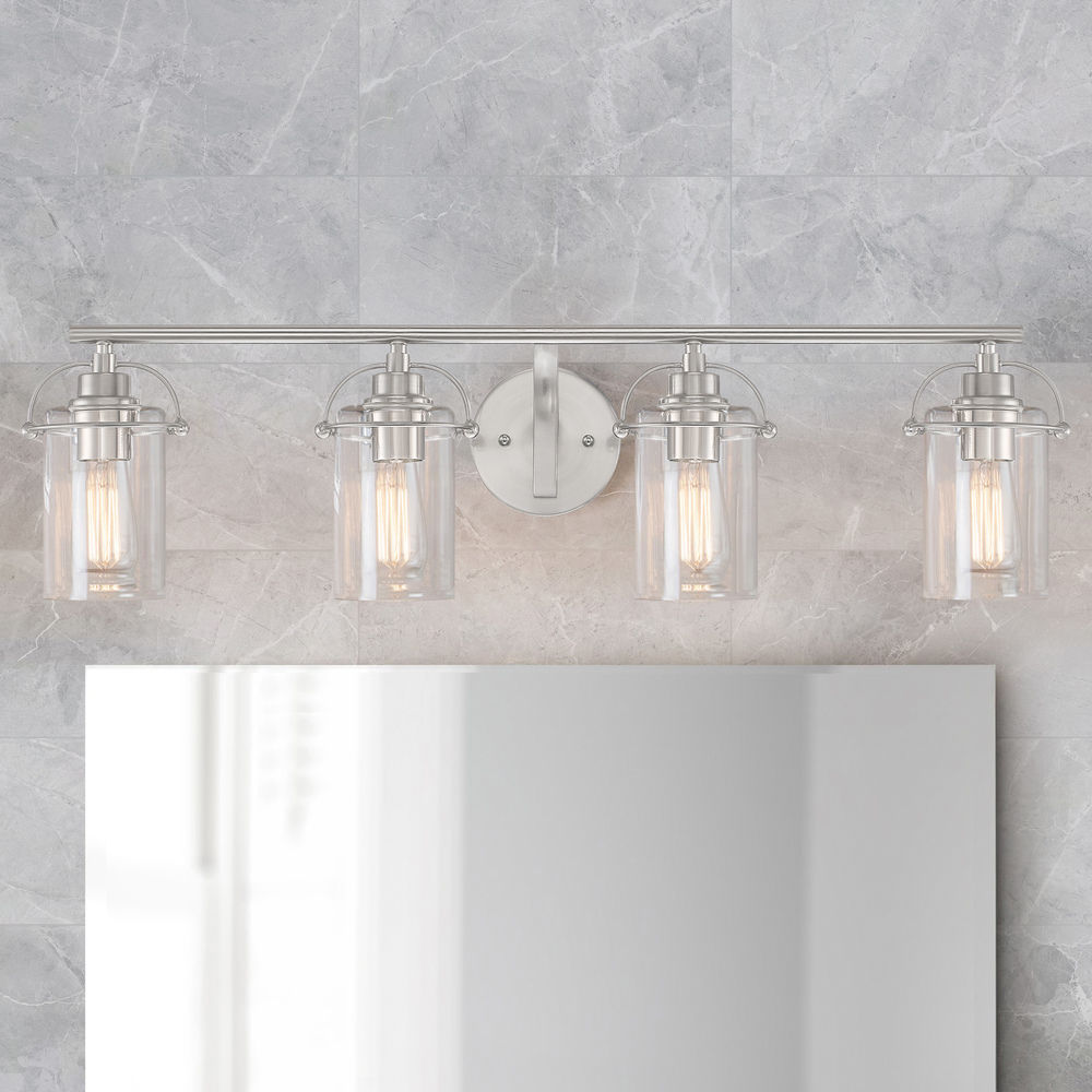 Transform your bathroom or walk-in closet with this four-light bath light from the Emerson collection by Quoizel. The silhouette of this light charms with intriguing harness-style brackets in lustrous brushed nickel over steel construction with simple clear glass shades. You can customize the look of this light by installing it up or down to suit your tastes.