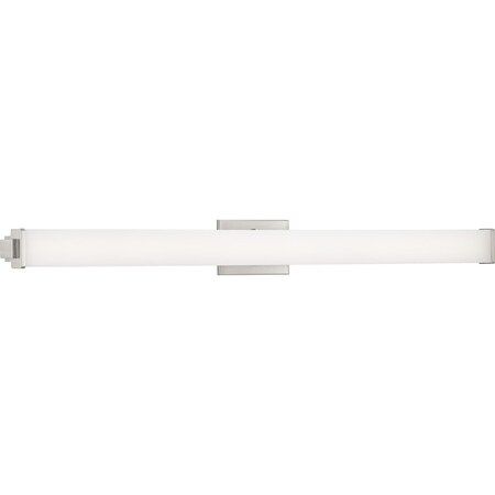 - bath bathroom interior inside indoor vanity powder room powderroom light lights lighting fixture fixtures brushed nickel silver gray grey modern LED integrated dimmable 1 one white shade