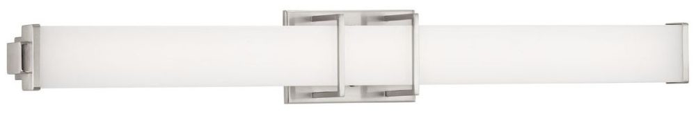 - bath bathroom interior inside indoor vanity powder room powderroom light lights lighting fixture fixtures brushed nickel silver gray grey modern LED integrated dimmable 1 one white shade