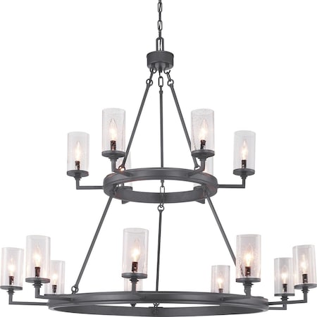 - With hand-forged details, the dark graphite base and seeded-glass shades make this chandelier a dramatic focal point