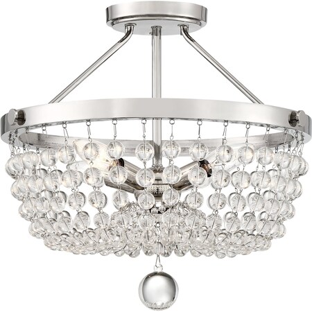 Bring opulence to your home in the form of this four-light glass bowl semi-flushmount ceiling light from the Teresa collection by Quoizel. Gleaming glass bead strands cascade in a glittering drape from the polished nickel finish over steel construction while an oversized crystal ball finial adds the final touch. At sixteen inches wide, this luxurious light is rated for damp locations and is well suited for a grand dining room or a majestic staircase.