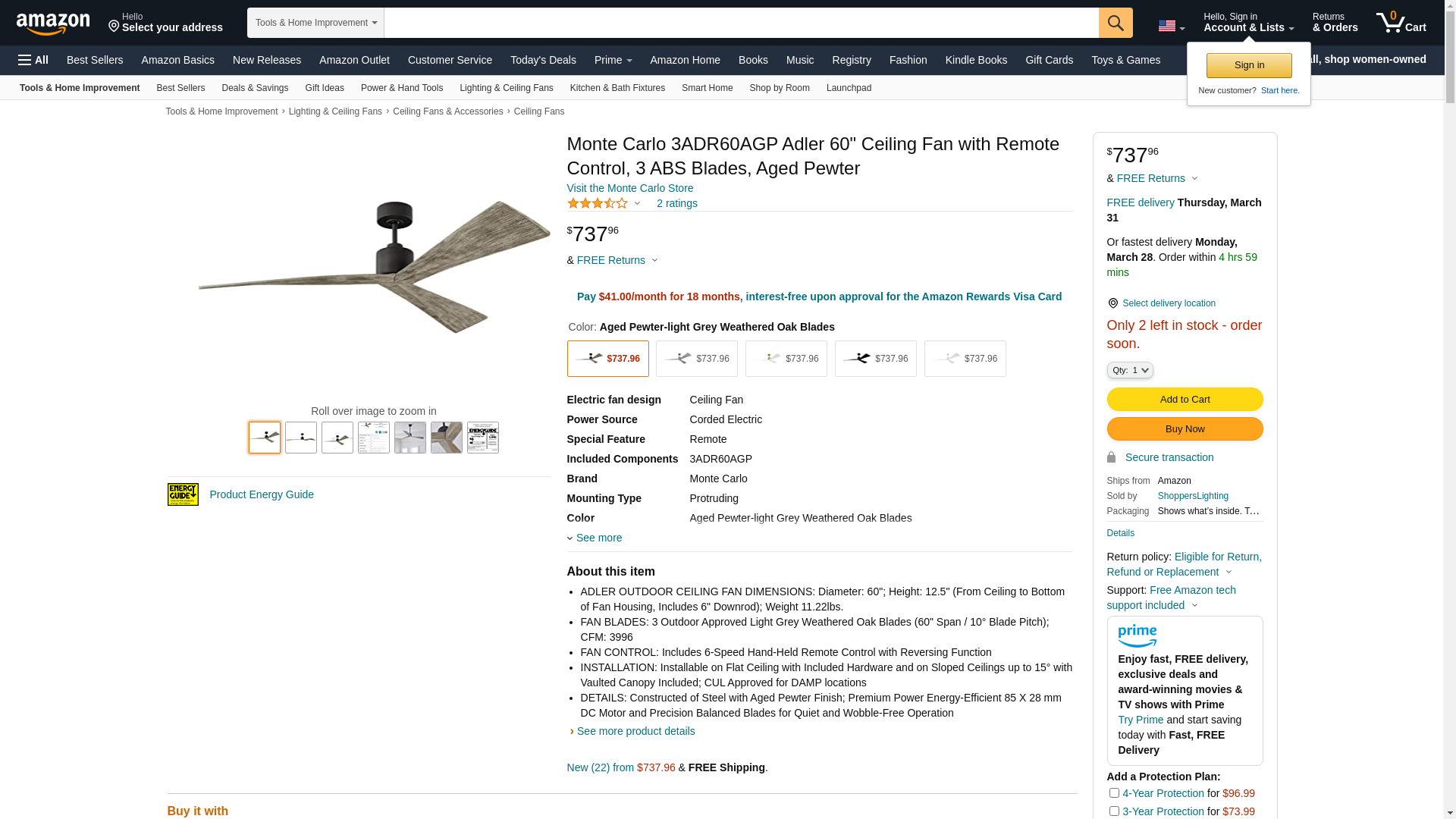 Monte Carlo 3ADR60AGP Adler 60" Ceiling Fan with Remote Control, 3 ABS Blades, Aged Pewter