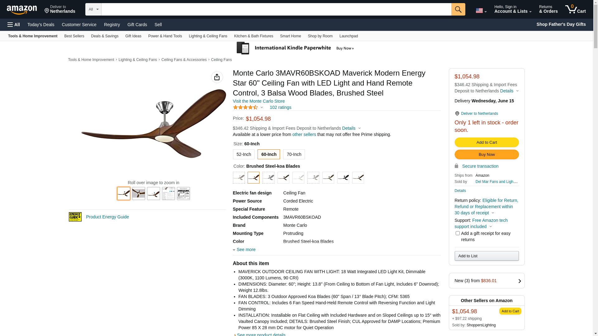 Monte Carlo 3MAVR60BSKOAD Maverick Modern Energy Star 60" Ceiling Fan with LED Light and Hand Remote Control, 3 Balsa Wood Blades, Brushed Steel