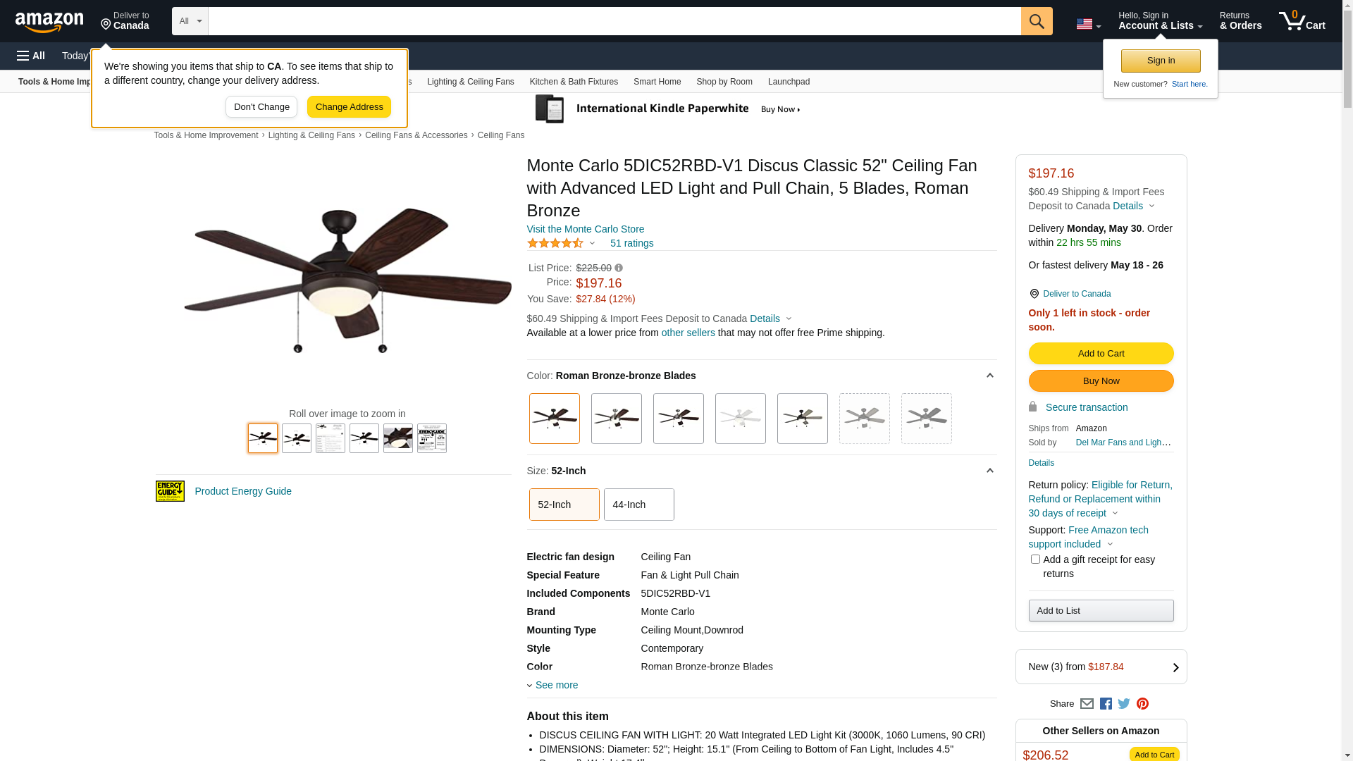 - FAN BLADES: 5 Roman Bronze ABS Blades (52" Span / 12° Blade Pitch); CFM: 3415