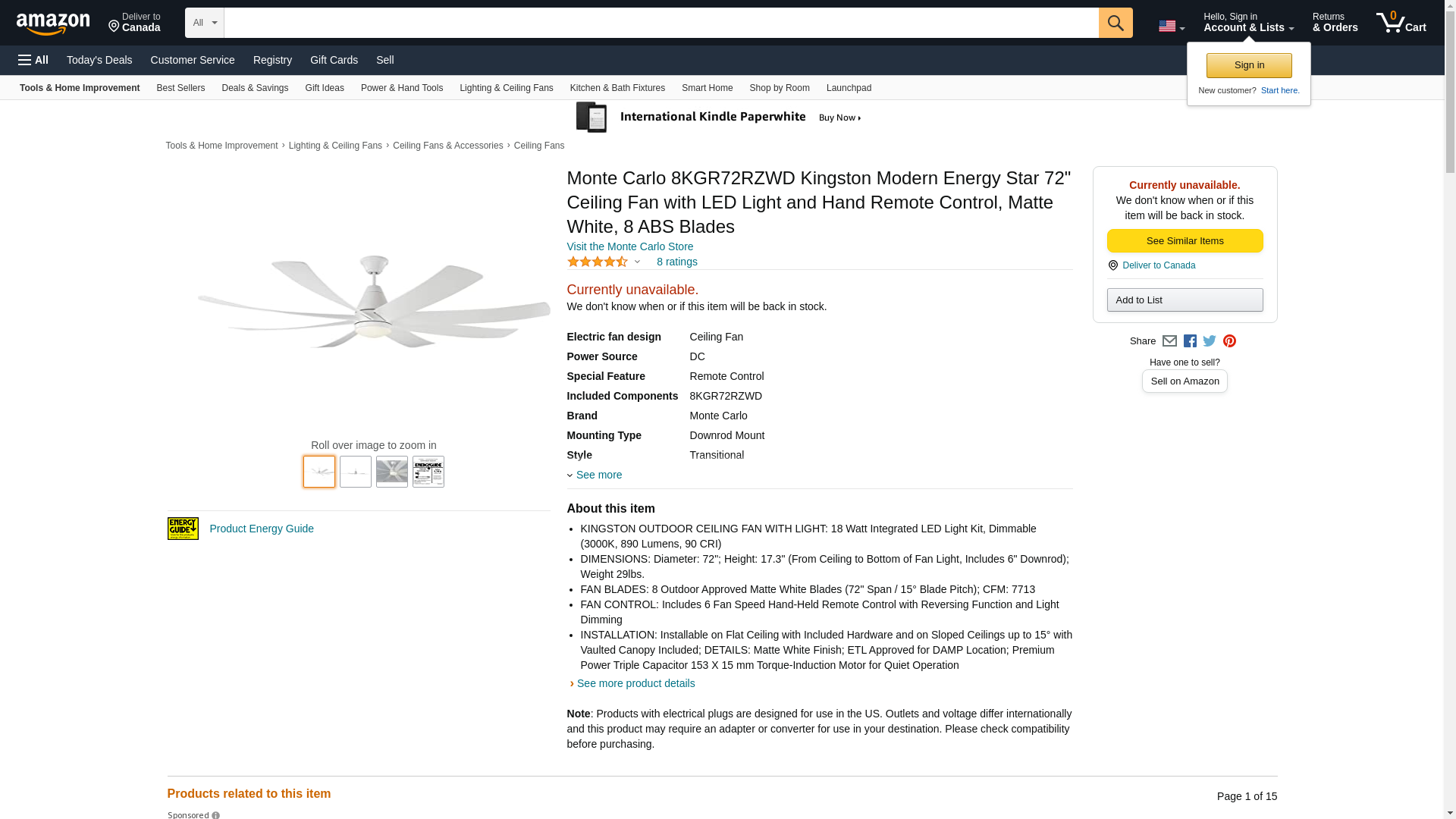 Monte Carlo 8KGR72RZWD Kingston Modern Energy Star 72" Ceiling Fan with LED Light and Hand Remote Control, Matte White, 8 ABS Blades
