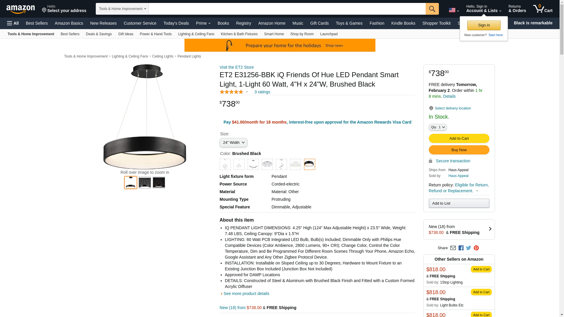 ET2 E31256-BBK iQ Friends of Hue LED Pendant Smart Light, 1-Light 60 Watt, 4" H x 24" W, Brushed Black