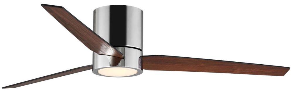 - REVERSIBLE PLYWOOD BLADES: Three reversible plywood blades coated in dual American walnut and black finishes rotate around a polished chrome center with a shatterproof white opal glass shade.