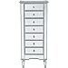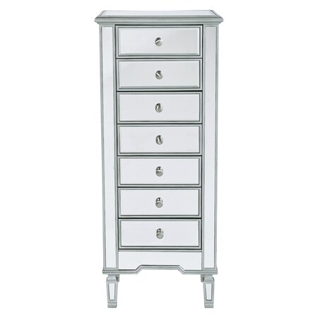Enhance your bedroom or dressing area with this elegant and sophisticated lingerie chest, pamper yourself! You can also store your treasured belongings or Silverware in this petite 7 drawer chest in any corner of your room. Dramatic and sophisticated, it has a hand paintedSilver finish, beveled mirror panels on all surfaces, drawers decorated with brushed steel knobs, and incised tapered legs. ?This chest are build to please! FEATURES: *Reflexion collection ?*7 drawer * brushed steel knobs *Hand paintedSilver finish ?*Beveled mirror panel *Solid wood trim and legs ?*Wood drawer glides ?*Inside lining painted in silver. ? PRODUCT DETAILS: Measurement W20xD15xH48? *Minor assembly required *Material in solid wood and engineered wood *1 year limited warranty.