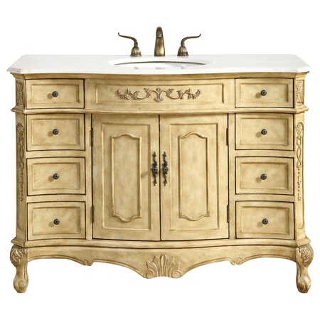This superb balance of timeless tradition and opulent beauty in a marble-topped vanity will certainly enhance the aesthetics of any home or office bathroom! Featuring an authentic natural white marble countertop?occasionally with light brown veining, complimenting the hand painted antique beige cabinet?oval white porcelain under mount sink, 2 doors and 8 drawers, as well as antique bronze finish door knobs, a superbly carved floral design, stands on stylishly carved solid wood French scroll feet. A truly rich statement of luxury! Measurements: W48? x D21? x H35?, fully assembled.