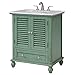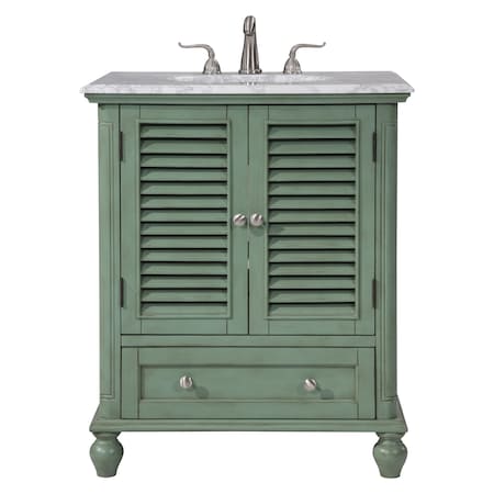 Enhance your guest or office bathroom with this rustic teal green vanity from our Rhodes collection. Featuring Italian Carrera white marble top with white under mount oval porcelain sink, on top of a plantation style cabinet with a pair of wooden shutter doors and a drawer underneath, provides plenty of storage space for your bathroom essentials, this vanity combines old world charm and ?functionality. ?FEATURES: ?*Rhodes collection ?*Measurements:W30xD22xH36? *Authentic Italian carrera white marble counter *Cabinet finish: antique teal green ?*Under mount oval porcelain sink *Made in solid wood and engineer wood *Number of doors: 2 *Number of drawers: 1 *Full extension metal drawer glides *Hardware finish: brushed steel *inside and back finish: green *Free standing *accommodates 1 sink *Pre-drill faucet holes, 8? spread. ?PRODUCT DETAILS: *Top materials: marble *Sink included: yes *Faucet included: no *Installation required: no *Assembly required: no *Base materials: wood *Mounting: free standing *Doors included: yes *Shelf: 1. ?