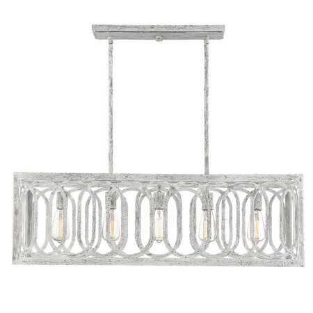 This beautiful Westbrook chandelier brings your home all the elegance and charm of the French countryside. The Savoy House Charisma finish has all the feel of distressed wood and the light-colored, soothing hue keeps the mood relaxed. Five exposed lights will hold E-style 60W bulbs. Rectangular frame has a lovely, intricate pattern of interlocking oval shapes. Its open and airy, allowing light to fill your room. This chandelier is both high interest and serene, blending easily with traditional, farmhouse, transitional, and modern vintage decor. 38 inches long and the ideal shape to put a natural yet refined, finishing touch in your dining room, kitchen, kitchen island, great room, or other gathering spaces. Dining Room/Living room/Family Room/Great Room/Bedroom/Kitchen/Foyer/Entryway/Stairway/Bathroom/Office/Billiard Room/Media Room / No. of Rods: 10 / Assembly Required: Yes / Canopy Included: Yes / Canopy Diameter: 4.38 / Rod Length(s): 12.00 / Dimable: Yes.