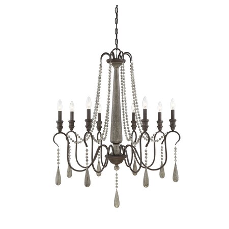 Weathered Ash creates a feeling of pastoral permanence, and the faceted chains and teardrop balls that anchor each light and the center-post finial, add an air of romance and caprice. Eight arms swoop low and return in a dramatic s-shape, peaked by candle cups that support 8 C type bulbs. (Candle shaped bulbs will complement the Kenwood's French Country feel). Beautifully detailed and ornamented, the Kenwood nonetheless offers an open, light profile, which contrasts nicely with the opacity of the materials. For those who wish to observe closely (and many will) there's a delightfully subtle study in contrasts here. The 8 light model is 33" in diameter. Subdued, but in its own quiet way, exuding confidence, the Kenwood will make your traditional or pastoral styles come alive with memories old and new.<br/><br/>Features :<br/><br/>- Materials: Metal, poly<br/>- Weathered ash finish<br/>- Room application: Dining room, living room, family room, great room, bedroom, kitchen, foyer, entryway, stairway, bathroom, office, billiard room, media room<br/>- Bulb base: E12<br/>- Recommended bulb shape: C11<br/>- LED compatible: Yes<br/>- Bulb included: No<br/>- Safety rating: UL, CUL<br/>- Dimmable: Yes.<br/><br/>Specifications :<br/><br/>- Product Dimensions : 40.5"H x 33"W x 33"D<br/>- Product Weight : 15.84 lbs<br/>- Product Dimensions : (Rod hung adjustable height) 163"<br/>- Product Dimensions : (Chain) 1 x 120"<br/>- Number of Lights : 8<br/>- Wattage : 60W<br/>- Voltage : 120V.