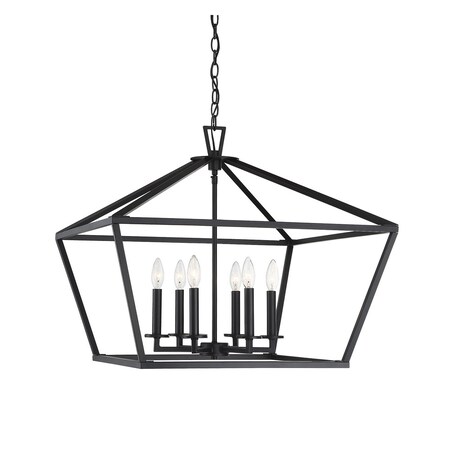 When you have a traditional aesthetic, and you’d like to inject a sense of modernism, choose this Townsend pendant. Classic lantern style has the familiar, vintage appeal of Colonial or Old English candle fixtures, but the open, sleek, geometric frame and matte black finish create a delightful contemporary twist. This timeless quality easily mixes with your traditional, contemporary, farmhouse, transitional, or industrial-inspired decor. Six lights within the open framework have metal candle covers and hold 60W C-type bulbs for the perfect amount of illumination. And at 26” wide by 23.5” high, this lantern-style pendant will fit superbly in dining areas, kitchens, living rooms, foyers, and rec rooms. Adjustable chain for custom placement of light in your home.
