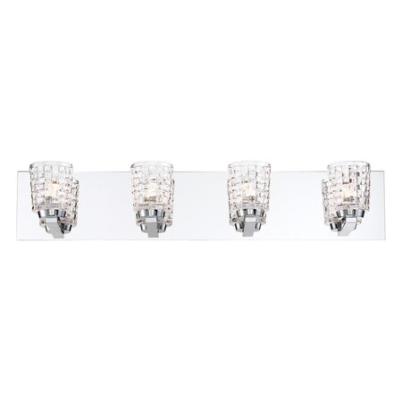 This 4 light Vanity Light from the Banbury collection by EuroFase will enhance your home with a perfect mix of form and function. The features include a Chrome finish applied by experts. Product Features Include: Brand: Eurofase, Collection: Banbury, SKU: 35648-017, UPC: 773546290111, Category: Bathroom Vanity Light, Finish: Chrome, Glass: Clear Woven Pattern, Shade: Clear, Material: Glass/Metal, Width: 26.75 in., Height: 5.00 in., Max Height: 5.25 in., Extension/Depth: 5.25 in., Backplate/Canopy Width: 5.25 in., Backplate/Canopy Length: 26.00 in., Backplate/Canopy Thickness: 1.25 in., Install Position: horizontal, Weight: 8.00 lb., Included Chain/Rods/Cord: 26in of Stem, Included Lead Wire: 6, Warranty: 1 year warranty, Bulbs Included: Yes, Bulb Category: LED, Primary Bulb(s): 4 x 6.00 watts LED INTEGRATED LED, Color Temperature: 3000K, Color Rendering Index: 90.0000, Total Lumens: 1920, Voltage: 120V, Outdoor Rating: Suitable for Damp Locations, Safety Rating: CETLUS Damp