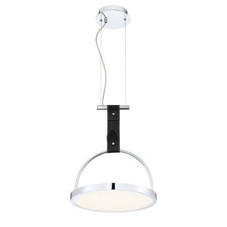 Lappin Large LED Pendant, Chrome Finish, Faux Leather with Flat chrome disk suspended by faux leather. <li>Product Type: Pendant<li>Fixture Style: Transitional<li>Fixture Shape: Round<li>Hanging Support Type: Aircraft Cable<li>Hanging Support Length: 72 inches<li>Cable/Wire Length: 72 inches<li>Chain Length: 72 inches<li>Slope Ceiling Compatible: Yes<li>Mounting Type: J-BOX<li>Location Type: DRY Location<li>Bulbs Included: Yes<li>Lumens: 2160<li>Bulb Kelvin: 3000<li>Dimmable: YES<li>More information: 36W/LED 3000K/2160lm (dimmable)<li>More Information: Opal Glass White Included<li>More Information: Hanging Support Type: Aircraft Cable<li>More Information: Rated for dry locations<li>Canopy Backplate Height: 1.25 Inches<li>Canopy Backplate Diameter: 7 Inches