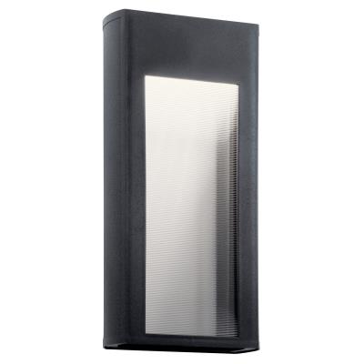 This outdoor LED energy-efficient one-light wall light from Kichler's Ryo collection highlights minimalist design. A clear ribbed glass shade juxtaposed with a textured black finish creates a streamlined, contemporary vibe. The geometric lines and white-on-black effect is subtly cool and sophisticated.