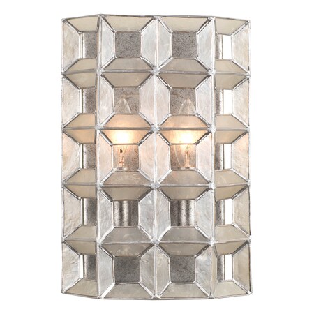 Inspired by the patterns found in Rome's Parthenon, the Prado Collection marries natural Capiz Shell with architectural design. Featuring a handcrafted open frame and cool Oxidized Silver Leaf finish.<br/><br/>Features :<br/><br/>- Materials: Steel, natural capiz<br/>- Finish: Oxidized silver leaf<br/>- Dimmable: Yes<br/>- Dimmer type: Refer to bulb manufacturer for compatibility<br/>- Sockets: 2<br/>- Lamp type: E12 Candelabra<br/>- Bulbs include: No<br/>- Listing: cETL<br/>- Rating: Damp<br/>- ADA certification.<br/><br/>Specifications :<br/><br/>- Product Dimensions : 12"H x 8"W x 4"D<br/>- Product Weight : 3 lbs<br/>- Product Dimensions : (Backplate) 6"W x 1"D x 11"H<br/>- Product Dimensions : (Max ext) 4"<br/>- Product Dimensions : (Mounting height) 6"<br/>- Product Dimensions : (Wire length) 7"<br/>- Wattage : 40W<br/>- Voltage : 120V.