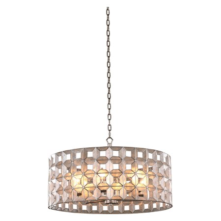 Inspired by the patterns found in Rome's Parthenon, the Prado Collection marries natural Capiz Shell with architectural design. Featuring a handcrafted open frame and cool Oxidized Silver Leaf finish.<br/><br/>Features :<br/><br/>- Materials: Steel, natural capiz<br/>- Finish: Oxidized silver leaf<br/>- Dimmable: Yes<br/>- Dimmer type: Refer to bulb manufacturer for compatibility<br/>- Sockets: 6<br/>- Lamp type: E12 Candelabra<br/>- Bulbs include: No<br/>- Listing: cETL<br/>- Rating: Dry.<br/><br/>Specifications :<br/><br/>- Product Dimensions : 16"H x 26"W x 26"D<br/>- Product Weight : 8 lbs<br/>- Product Dimensions : (Canopy) 6"W x 6"D x 1"H<br/>- Product Dimensions : (Chain length) 48"<br/>- Product Dimensions : (Wire length) 96"<br/>- Wattage : 60W<br/>- Voltage : 120V.