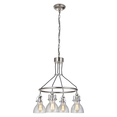 Features Constructed from brass Comes with clear glass shades Sloped ceiling compatible (4) 60 watt maximum medium (E26) bulbs required Dimmable with compatible dimming bulbs 72" of adjustable chain included Recommended for use with Vintage Edison bulbs CUL rated for dry locations Covered under a 1 year manufacturer Dimensions Fixture Height: 27-1/4" Maximum Hanging Height: 97" Width: 23-11/16" Depth: 23-11/16" Product Weight: 14.021 lbs Chain Length: 72" Wire Length: 96" Shade Height: 6-1/8" Shade Width: 6" Canopy Height: 1-5/16" Canopy Width: 6-3/8" Electrical Specifications Max Wattage: 240 watts Number of Bulbs: 4 Max Watts Per Bulb: 60 watts Bulb Base: Medium (E26) Bulbs Included: No