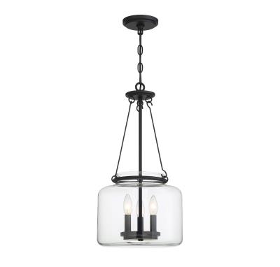 This 3-light pendant light from Savoy House is a part of the Akron collection and comes in a matte black finish. It measures 12" wide x 24" high. It uses three candelabra bulbs up to 60watts each. This light would look best in the dining room or kitchen. For indoor use.