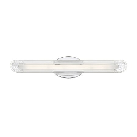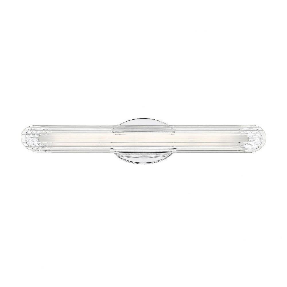 The Delaney vanity fixture features a modern aesthetic with a touch of industrial inspiration. The frame has an understated, practical, and sleek design, with an oval wall plate that supports a tubular shade -all with a bright, clean, polished chrome finish. The cylindrical shade has rounded ends and is made of gorgeous, faceted, clear glass. Altogether, its a streamlined, elegant look ideal for contemporary, transitional, nautical decor styles. One 33W, LED bulb is included for ample illumination above the vanity. This Delaney light fixture measures 24 wide and 5 high, extending 4 from the wall. Its a perfect fit for sophisticated, high style in your bathroom or powder room. 3000 / 2900 / 90+ / Bathroom/Bed Room/Dining Room/Living Room/Family Room/Great Room/Kitchen/Foyer/Entryway/Stairway/Hallway/Office/Billiard Room/Media Room / Mounting Direction: Horizontal & Vertical / Assembly Required: Yes / Dimable: Yes. Assembly Required: Yes / Mounting Direction: Horizontal & Vertical / Back Plate Height: 7.00 / Back Plate Width: 7.00 / Dimable: Yes / Shade Included: Yes / Shade Dimensions: 2.75 x 1.3 x 21.