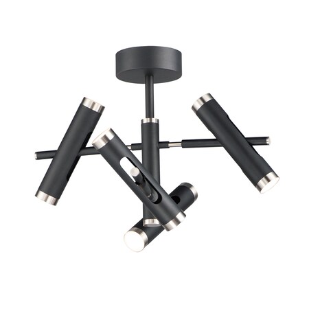 Adjustable cylinders pivots on axis with light emitting from both the top and the bottom for even illumination throughout the room. Finished in Black with a contrasting Satin Nickel trim, this contemporary look is both a dramatic statement as well as functional lighting.<br>LED Flush Mount<br>Collection: Ambit<br>Finish: Black / Satin Nickel<br>Width: 24.75"<br>Height: 16.50"<br>Length: 24.75"<br>Safety Listing: Damp<br>Bulbs: 8 X PCB 3W 1920lm, Included