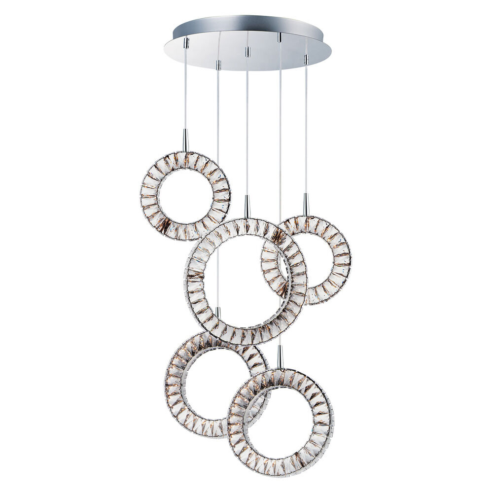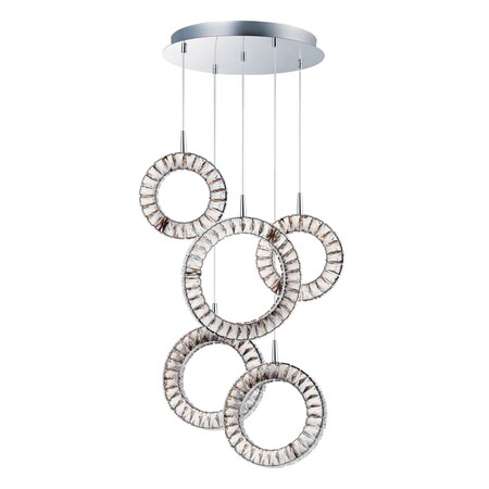 Rings of Beveled Crystals are mounted into a Polished Chrome band and suspended from cable as if they were floating in air. Multiple size rings mounted in descending order create a unique and brilliant light form which is sure to be the focal point of the room.<br>LED Pendant<br>Collection: Charm<br>Finish: Polished Chrome<br>Width: 23.75"<br>Height: 16.50"<br>Length: 23.75"<br>Safety Listing: Dry<br>Bulbs: 5 X PCB 80W 9130lm, Included