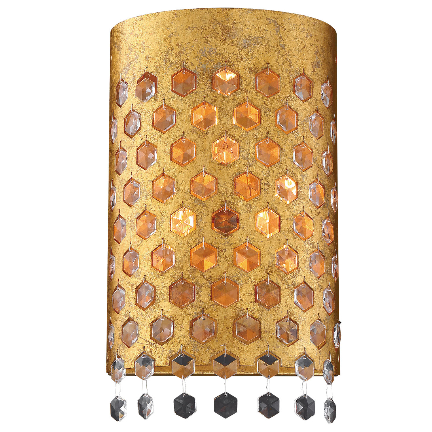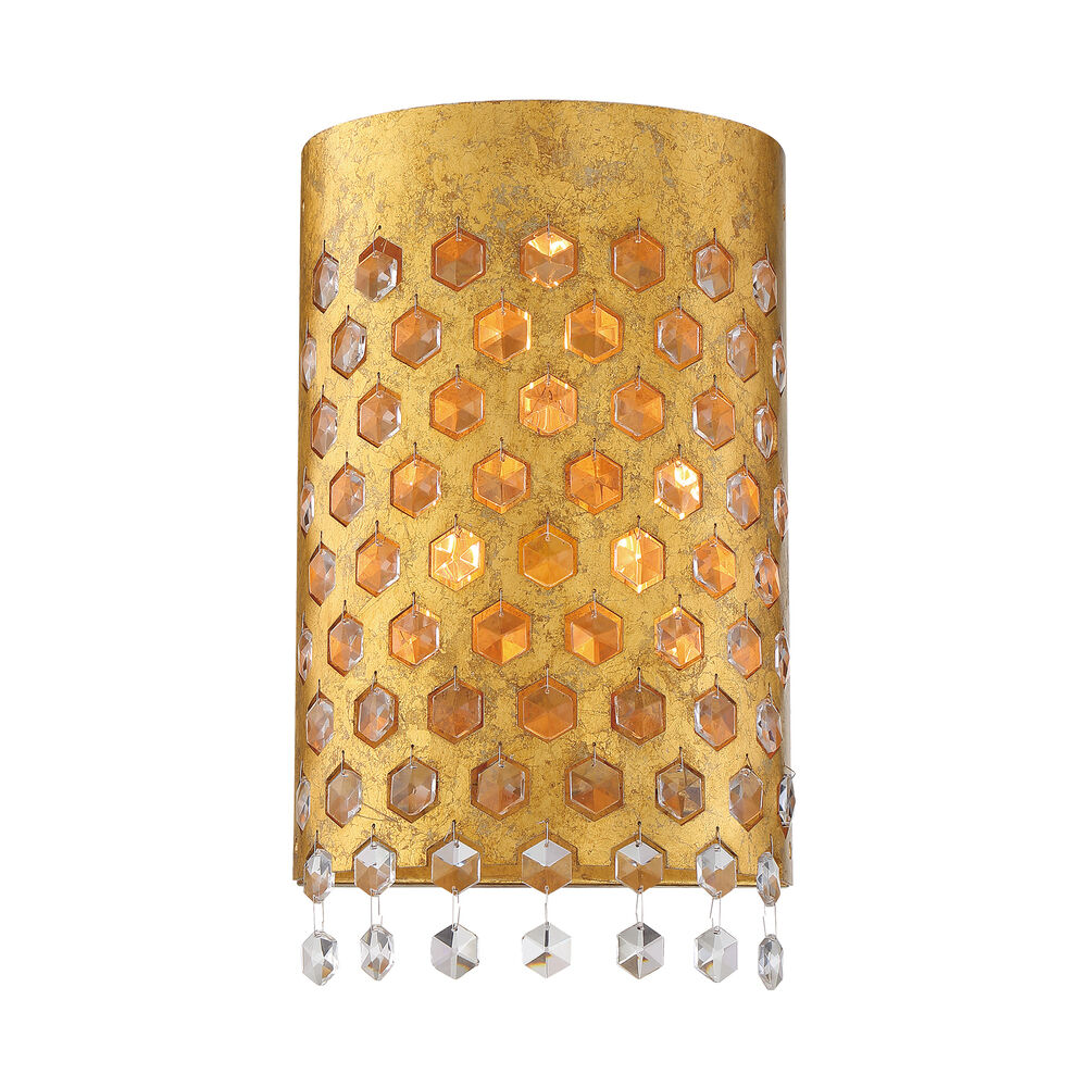 Designed for maximum elegance, this stunning wall sconce creates an exotic atmosphere with a traditional feel, yet it's perfectly compatible in transitional settings. Bring a rush of warmth with a half-round cutout shade made from steel and given a gold leaf finish. Dangling crystal accents finish its artistic character, making this sconce from the Ruxton collection by Metropolitan a wise choice. Dimmable with the purchase of optional dimming components.