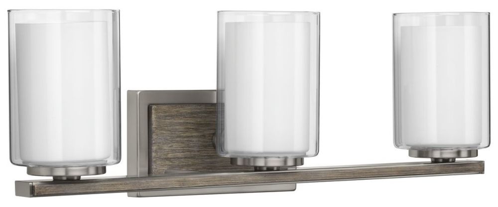 - Three-light wall vanity fixtures blend the warmth of a faux wood back plate with a clean, modern pediment supporting a double-glass shade