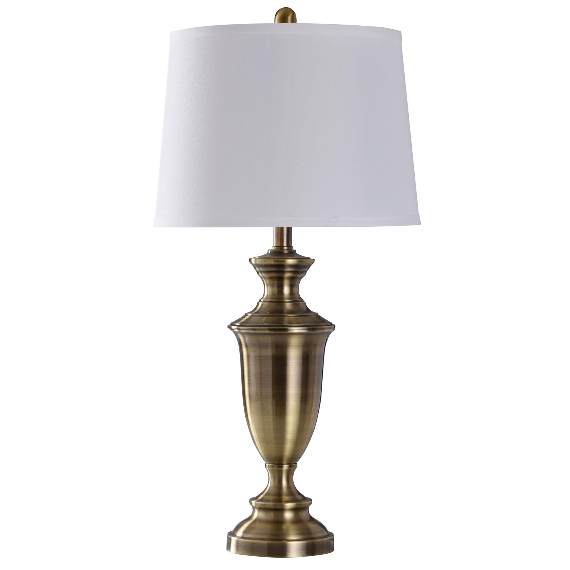Steel Table Lamp - Antique Brass - Heavy WhiteFeaturesA Handpainted Finish Means Each Piece Is Unique, With Possible Slight Variations. No Two Lamps Are Exactly Alike.With The Antique Brass Finish On The Base And The White Linen Shade, This Lamp Has A Very Traditional Design Style. Shade Shape: Tapered Drum Switch Type: 3-Way Switch Location: Neck Shade Length: 12 Shade Width: 14 Shade Height: 10 Cord (in.): 60 - Clear Socket Quantity: 1 Wattage: 100 Bulb Shape: A21 Socket Type: E26 Lamp Type: Incandescent Voltage: 120 Battery Details: No Batteries Required Collection: Steele Assembly Required: NoProduct Care Wipe clean with a dry cloth. Color: Antique Brass Material: Steel, Hardback Fabric Product Dimension: 12 x 14 x 30 Made In China