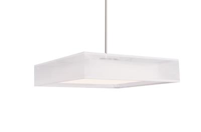 The black or white organza shade that covers the concealed Aluminum and Steel chassis gives depth and structure to this square shaped pendant lamp. Each edge of the square lamp shade is 19-5/8 and is attached to the ceiling with a single stem. The dimmable LEDs are efficiently diffused with a white acrylic panel - always a glow never a glare. Shade Included: TRUE / Dimable: TRUE / Warranty: 5 years / Color Temperature: 3000 / Lumens: 4200 / CRI: >90 / Rated Life: 50000 Hours. <UL>Warranty: 5 Years</UL>