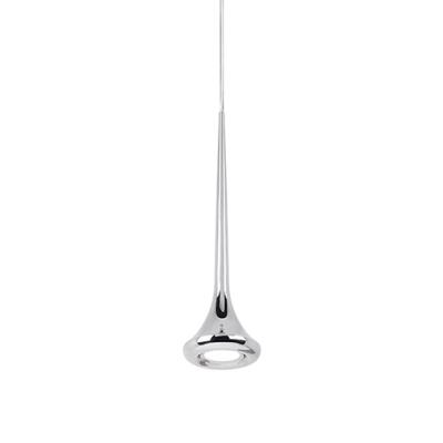 Collection: Bach, Finish Color: Chrome, Width: 5", Height: 19", Lamping Type: LED, Wattage: 9 Watts, Cri: 90, Color Temperature: 3000 Kelvin, Lumens: 800, Dimmable: Yes, Moisture Rating: Dry Rated, Desc: Single LED lamp pendant, slender trumpet shaped with bottom frosted diffuser. Chrome canopy and metal details, adjustable wire up to 72 inches.,