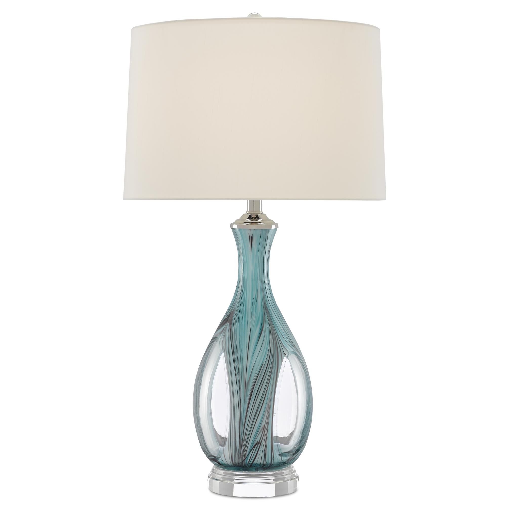In the hands of our artisans, molten lass morphs into luminous creations, as is the case with our Eudoxia Table Lamp made of blue blown lass. The push/pull of the artistÖs handlin of the lass that creates the cut-outs in the body of this turquoise lam 6.25 x 1.516.5 x 8 / 2.00 / Silver / Ball / 9.00 / Nickel / Mountin Direction: Ambient / Shade Included: Yes / Cord Lenth: 7.60.