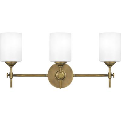 Bestow your bathroom with the warmth and vintage style of this Mid-Century Modern three-light dimmable bath light from Quoizel. It features a weathered brass finish with thin arms and knob details for a retro feel you'll enjoy for years. Adding to the charming warmth is opal etched glass shades that diffuse the light for a serene ambient glow.