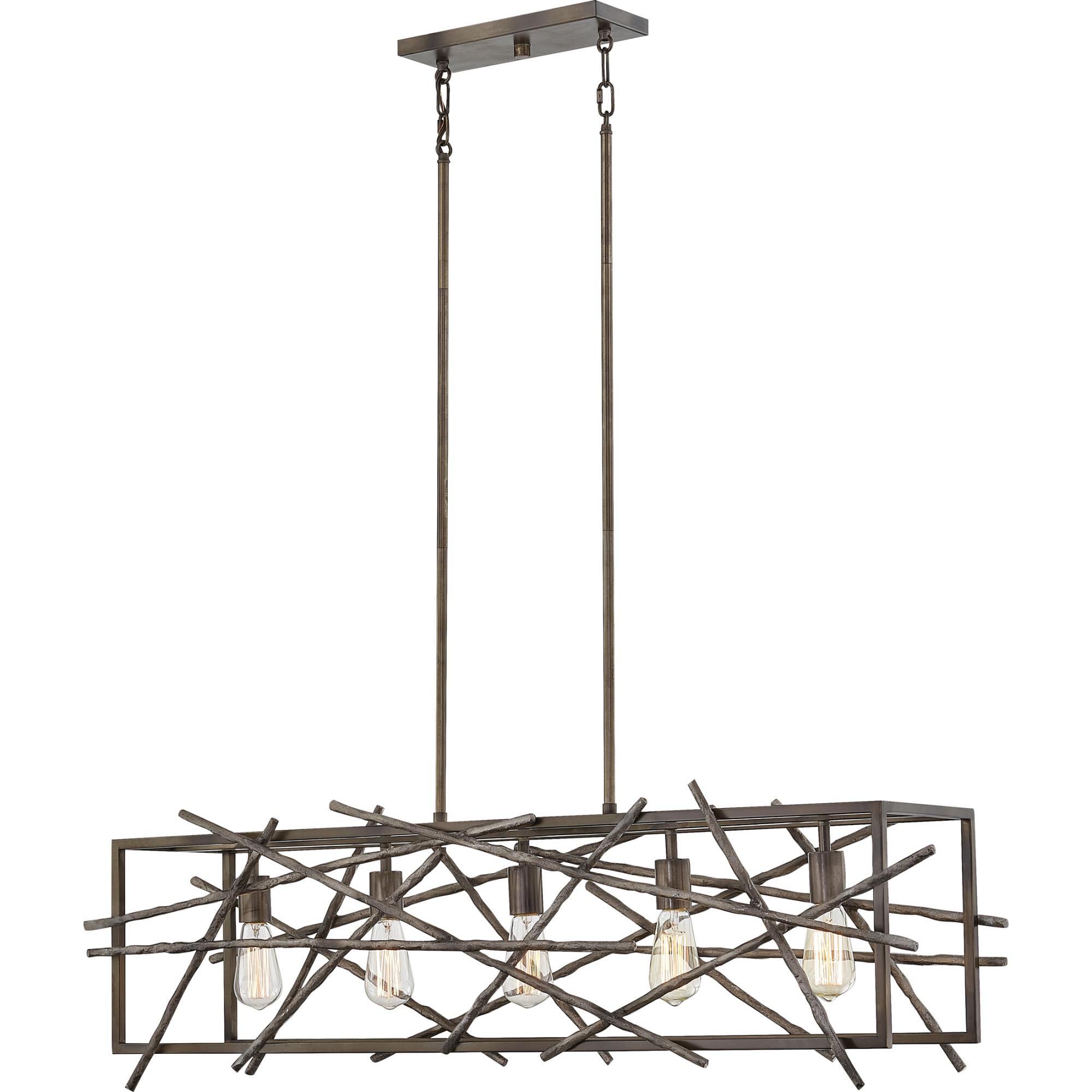 A lively attitude calls attention to the whimsically artistic look of the Brigham island pendant light, bringing certain energy and a twist on industrial appeal. This island light from Quoizel blends and open steel rectangle with a lush bronze finish with keenly placed stick pieces partially obscuring symmetrical bulb mounts. Its linear vibe is slightly chaotic as it adds a ton of personality in a show-stopping way.