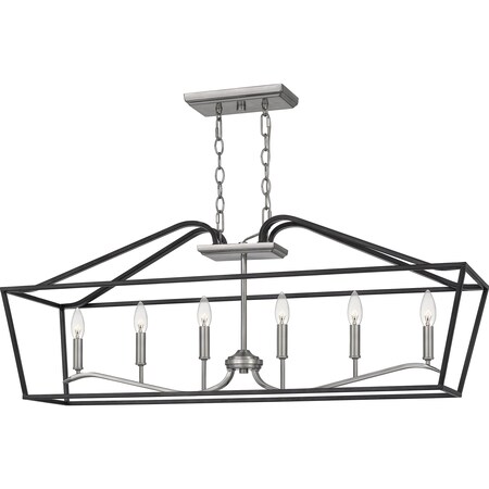 Starting with a basic linear silhouette and adding romantic curves and contrasting finishes, this stunning Catalina six-light island pendant by Quoizel becomes a focal point in a custom kitchen or entertaining space. Glam goes farmhouse cool with a blend of black finish steel with brushed nickel accents, as an open geometric frame reveals a gracefully curved line of candelabra bulb mounts. This delightful contrast of both palette and motif works to the advantage of a sharp designer bringing opulence to a transitional or modern space.