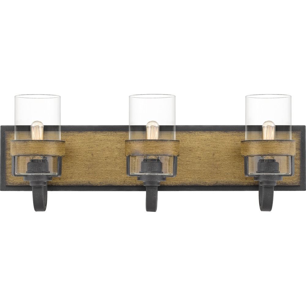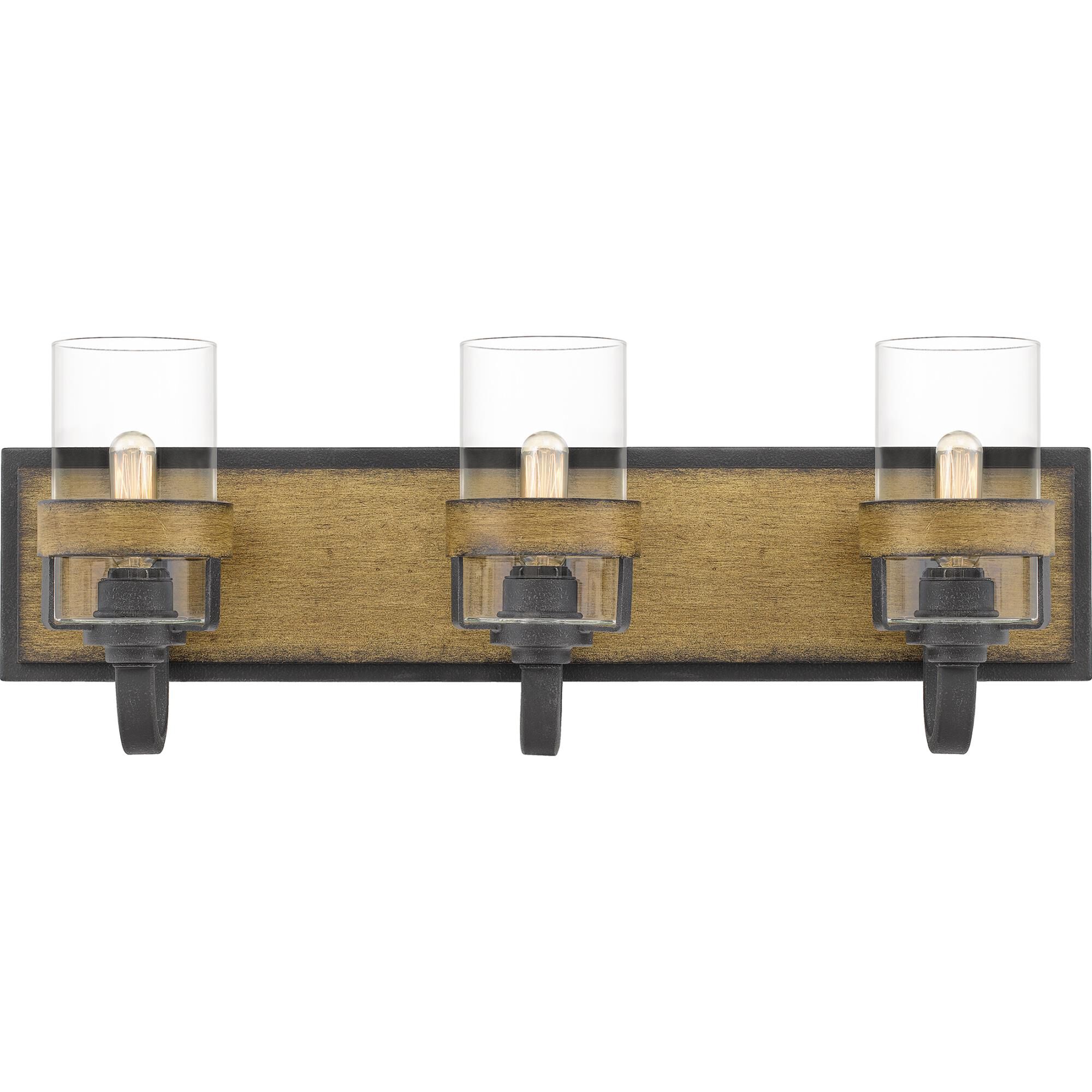 - Rustic farmhouse three-light dimmable bath light from the Finch collection by Quoizel.