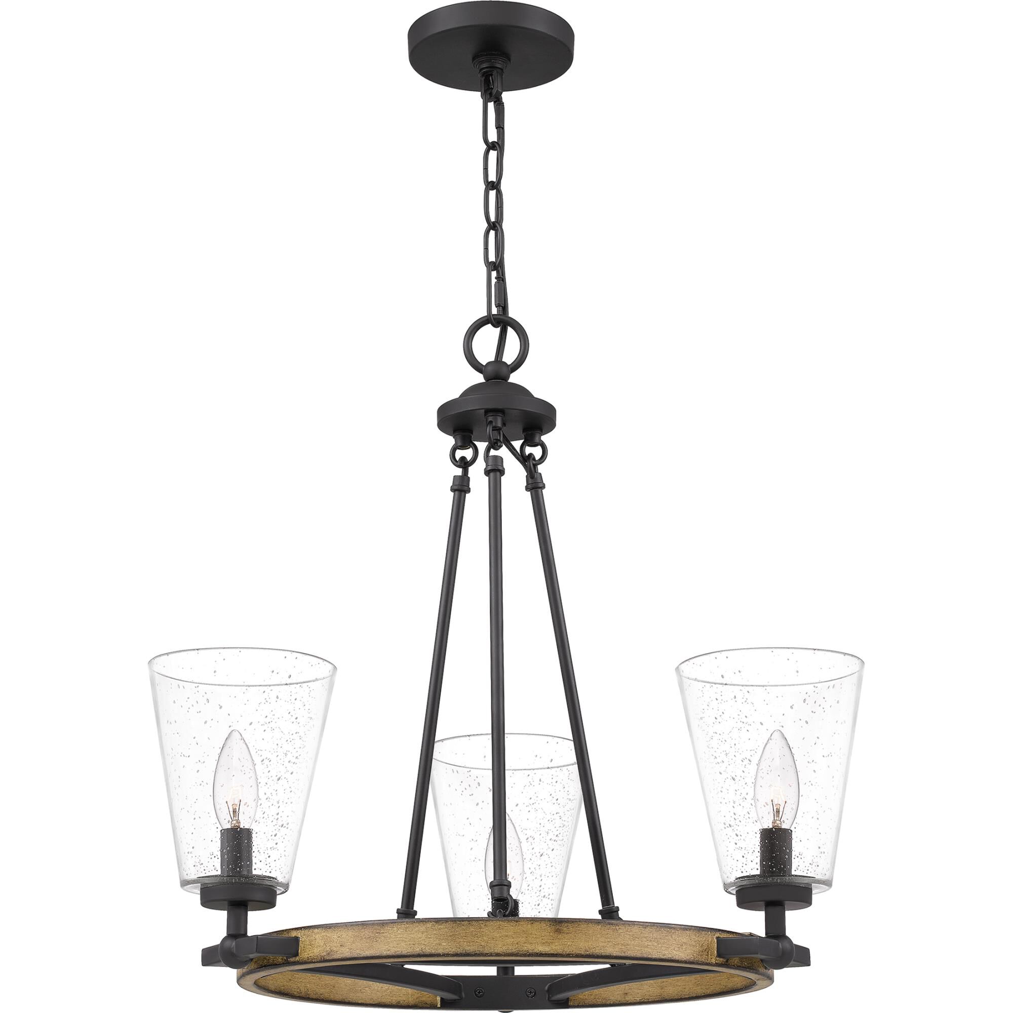 The farmhouse flair of the Hearst collection will be the perfect addition to your home. Finished in Matte Black and paired with a painted Aged Walnut wood finish, the wagon wheel silhouette adds a charming feel to your home decor. The clear seedy glass shades add texture and diffuse the light creating a warm, soft glow. <UL>Warranty: 1 Year<LI>Room Style: Dining/Entry/Foyer/Kitchen / Canopy Included: Yes / Shade Included: Yes / Cord Length: 96.00 / Canopy Diameter: 5.00 X 5.00.