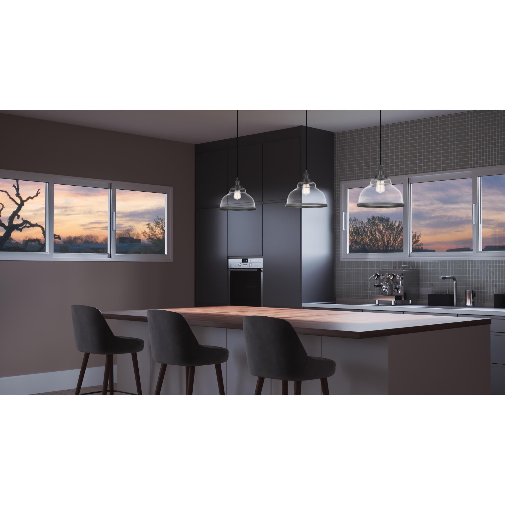 Light up a nook or reading space with the tastefully designed Leo mini-pendant by Quoizel. This mini-pendant light offers a basic appeal to farmhouse charm and no-nonsense style. A prominent, shapely clear glass shade shields a single candelabra bulb mount, rimmed in antique nickel finish steel. Matching nickel accents and a black down rod mix up a sleek palette, offering an industrial influence perfect for a casual transitional space.