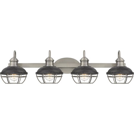 - Industrial four-light dimmable bath light from the Sandpiper collection by Quoizel.