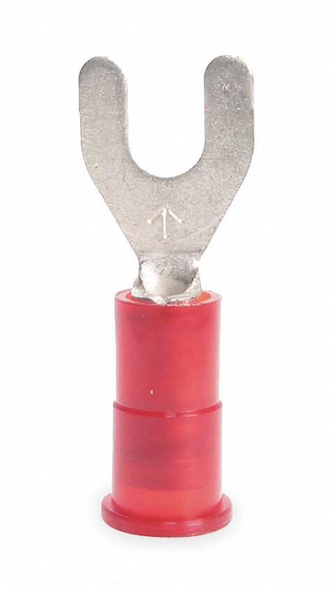 Fork Terminal, Contact Finish Tin, Contact Material Copper, Insulation Color Red, Insulation Material Nylon, Maximum Operating Temperature 221 Degrees F, Maximum Voltage 600 V, Maximum Wire Size 18 AWG, Stud Size #6, Termination Style Crimp, RoHS Compliant Yes, Seam Style Butted, Standards CSA Certified, UL Listed, Barrel Length 44 in, Connection Material Copper, Connection Type Crimp, Minimum Operating Temperature -40 Degrees F, Minimum Wire Size 22 AWG, Overall Length 0.89 in