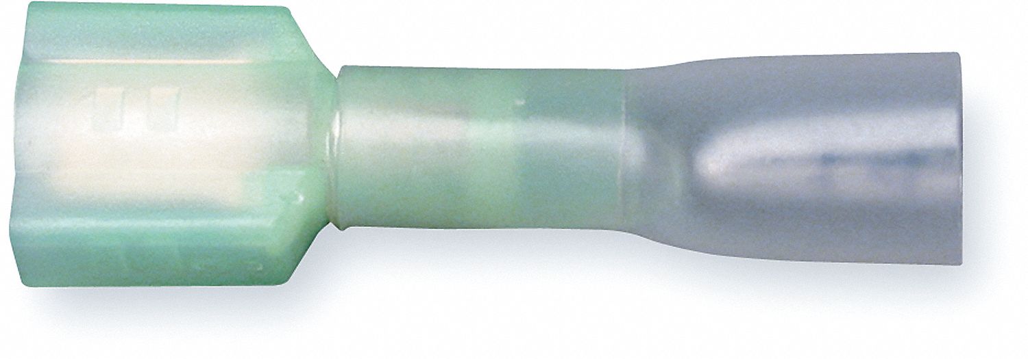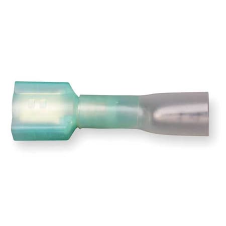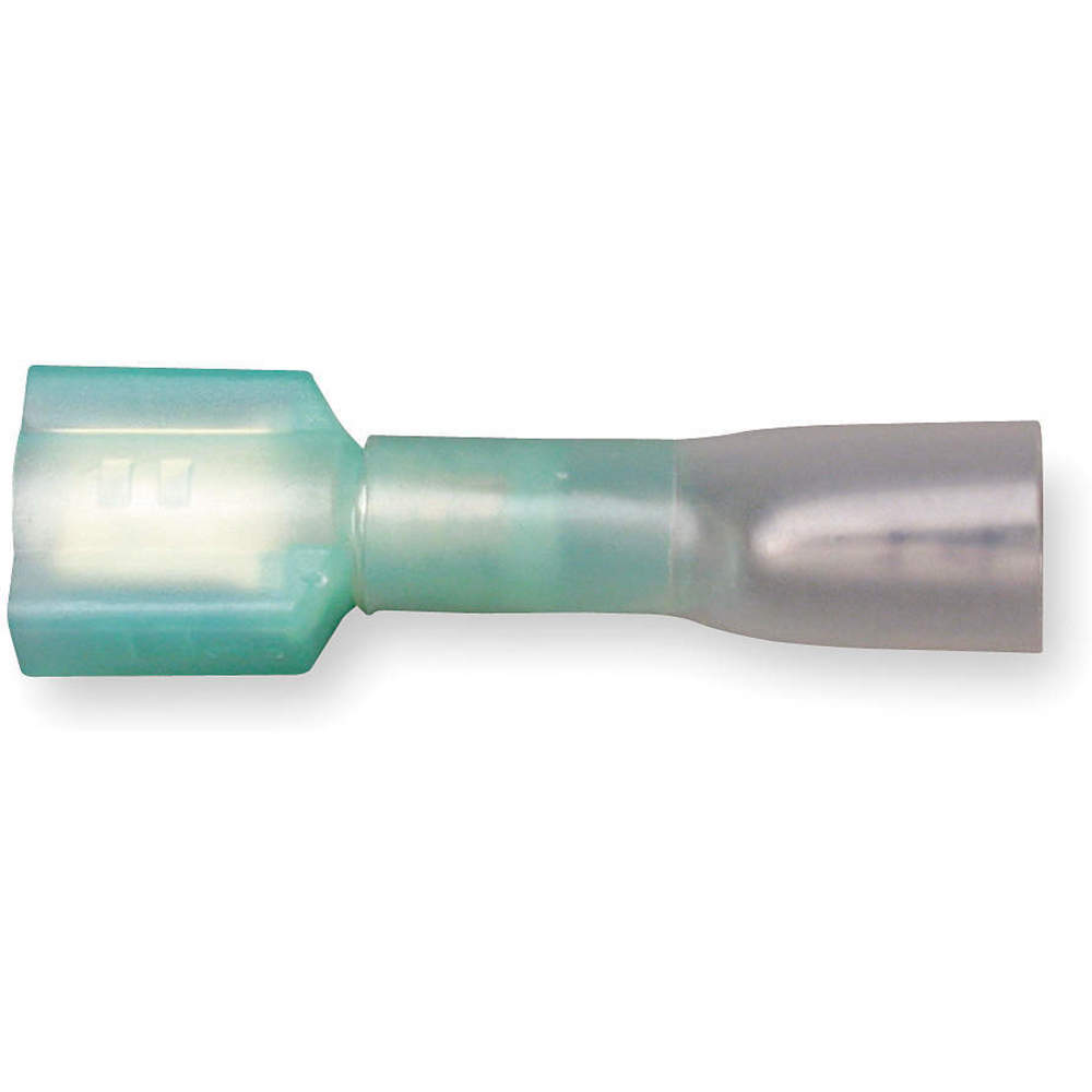 'Male Disconnect, Insulation Full, Insulation Type Heat Shrink, Insulation Color Blue, Wire Range 16 to 14 AWG, Tab Size 0.032 In. x 0.250 In., Barrel Inside Dia. 0.085 In., Max. Temp. 221 Degrees F, Max. Voltage 600V, Overall Length 1.200 In., Seam Butted, Connection Material Tin-Plated Brass, Standards UL Listed, CSA Certified, RoHS Compliant, Connection Type Crimp, Package Quantity 25'
