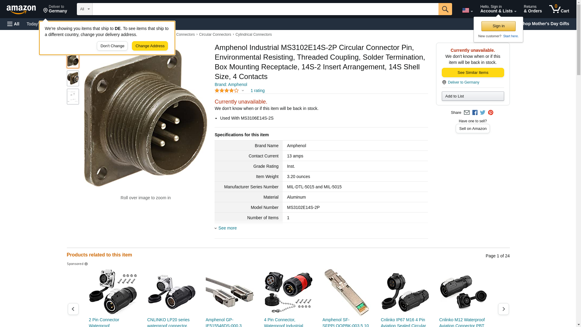 | MS3102E14S-2P | 1 | 269 | 1 | 1 @ $5.33, 25 @ $5.03, 50 @ $4.76, 100 @ $4.51, 500 @ $4.29 |