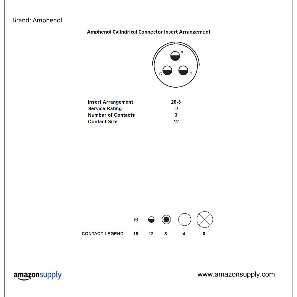 Specification: MIL-DTL-5015<br>Sealing: Meets IP67<br>Shielding: Yes<br>Connector Type: Circular<br>Connector Style: Receptacle<br>Mounting Type: Box - Front Mount - Thru Holes<br>Number of Contacts: 3<br>Contact Style: Pin<br>Termination Method: Solder<br>Insert Arrangement: 20-3<br>Contact Size: 3#12<br>Contacts Supplied: Yes<br>Contact Material: Copper Alloy<br>Contact Plating: Silver<br>Shell Material: Aluminum Alloy<br>Shell Plating: Olive Drab Chromate over Cadmium<br>Shell Color: Olive Drab<br>Insert Material: Neoprene<br>Grommet Seal Material: Neoprene<br>Amperage Rating: 23A<br>Operating Voltage DC: 1250<br>Operating Voltage AC: 900<br>Operating Temperature: -67 to +257 (-55 to +125)<br>Contact Mating life: 100<br>RoHS: No<br>Insert Rotation Keying: Normal