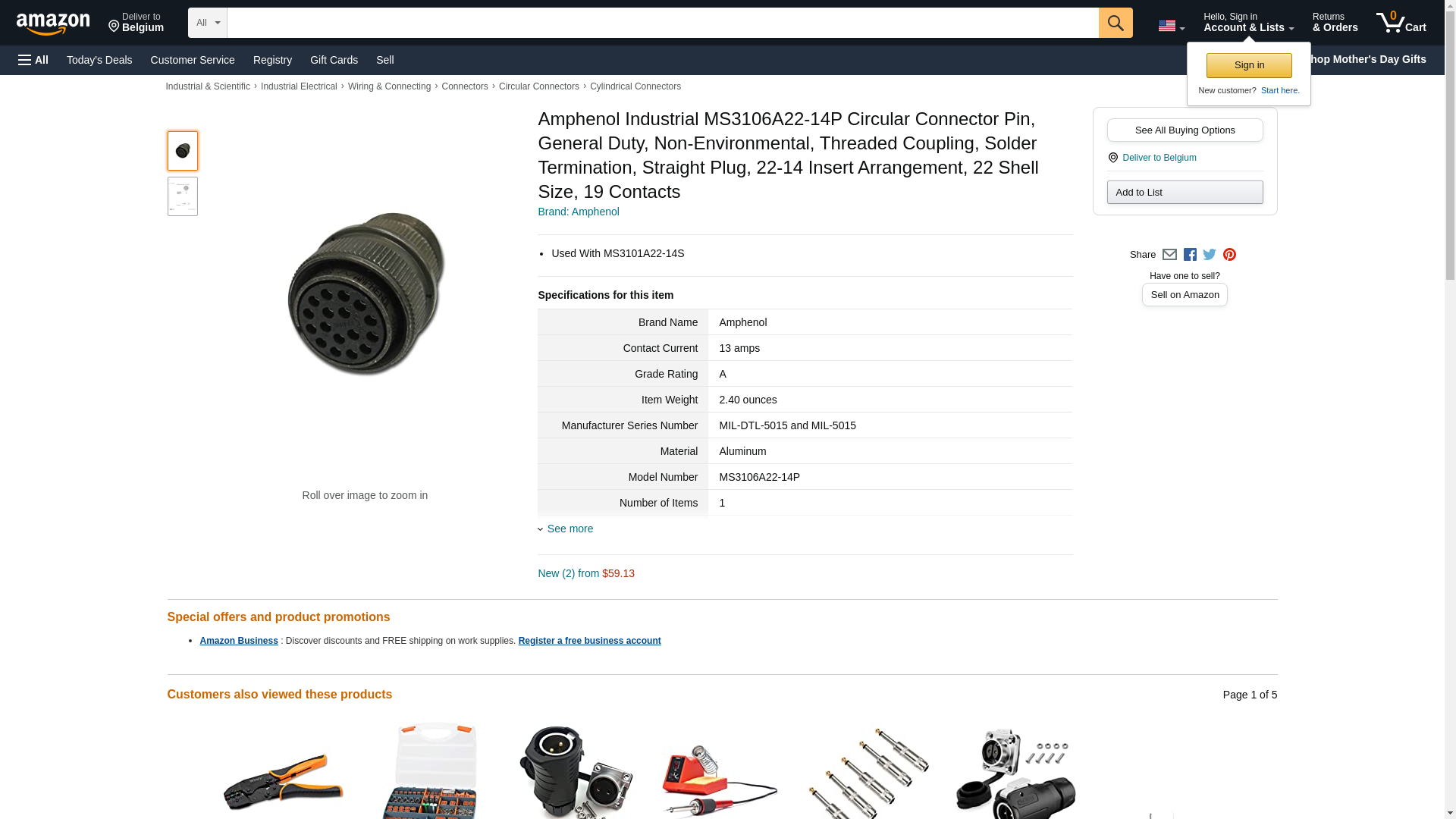 | MS3106A22-14P | 1 | 64 | 1 | 1 @ $25.64, 10 @ $25.13, 25 @ $21.65, 50 @ $21.22, 100 @ $17.34 |