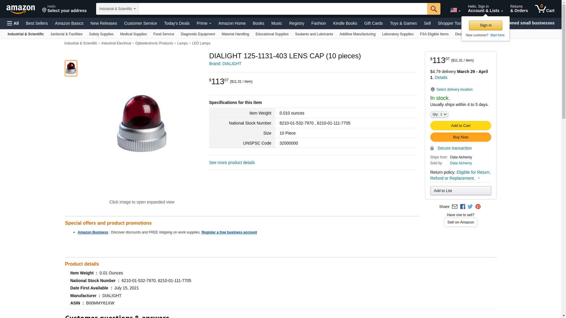 | Waldom | DIALIGHT CORPORATION 125-1131-403 | 10 | 1 | 10 @ $7.63, 40 @ $7.46, 75 @ $7.32, 95 @ $7.05 | |