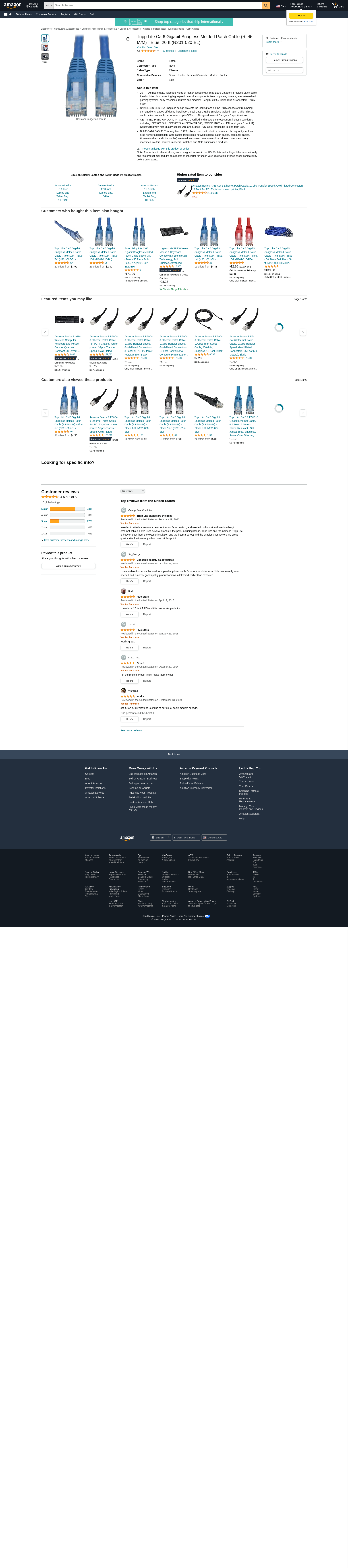 Tripp Lite N201-020-BL Cat6 Gigabit Snagless Molded (UTP) Ethernet Cable (RJ45 M/M), Blue, 20 ft. (6.09 m) | JensenTools
