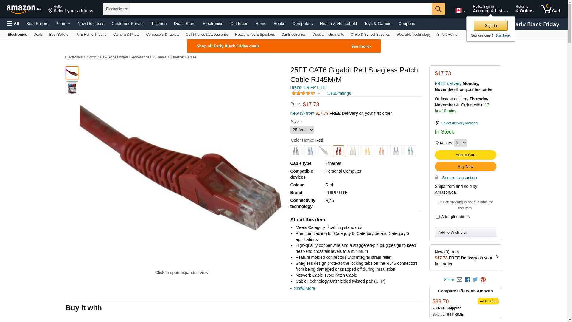 Tripp Lite 25' Cat6 molded patch cable in red color featuring high quality copper wire and a staggered-pin plug offers guaranteed performance in minimizing near-end crosstalk levels. Tripp Lite 25' Cat6 RJ45 Male/Male Gigabit Snagless Molded Patch Cable, Red Red. Cable type: Category 6. Cable length: 25'. Material: Polyvinyl chloride (PVC) jacket. Connector details: 1 x RJ-45 male network on first and second end. Technology: Unshielded twisted pair (UTP). Conductor: Copper, Wires per cable: 8, Pairs per cable: 4. Features: Snagless, molded. Rated for 550 MHz/1 Gbps communication. Application: Computer networking. System requirements: For 1000 Base-T (1Gbps Ethernet), 10/100 Base-T (Ethernet), 100 Mbps TPDDI, 155 Mbps ATM, ISDN, voice and Token Ring TYPE 3 applications as well as EIA/TIA applications. Drastically reduce impedance and structural return loss, staggered-pin plug design to keep near-end crosstalk levels to a minimum. Integral strain relief. Certification and Standards: UL, IEEE 802.3ab, IEEE 802.5, ANSI/EIA/TIA 568, ISO/IEC 11801, ETL. Warranty: Lifetime limited.
